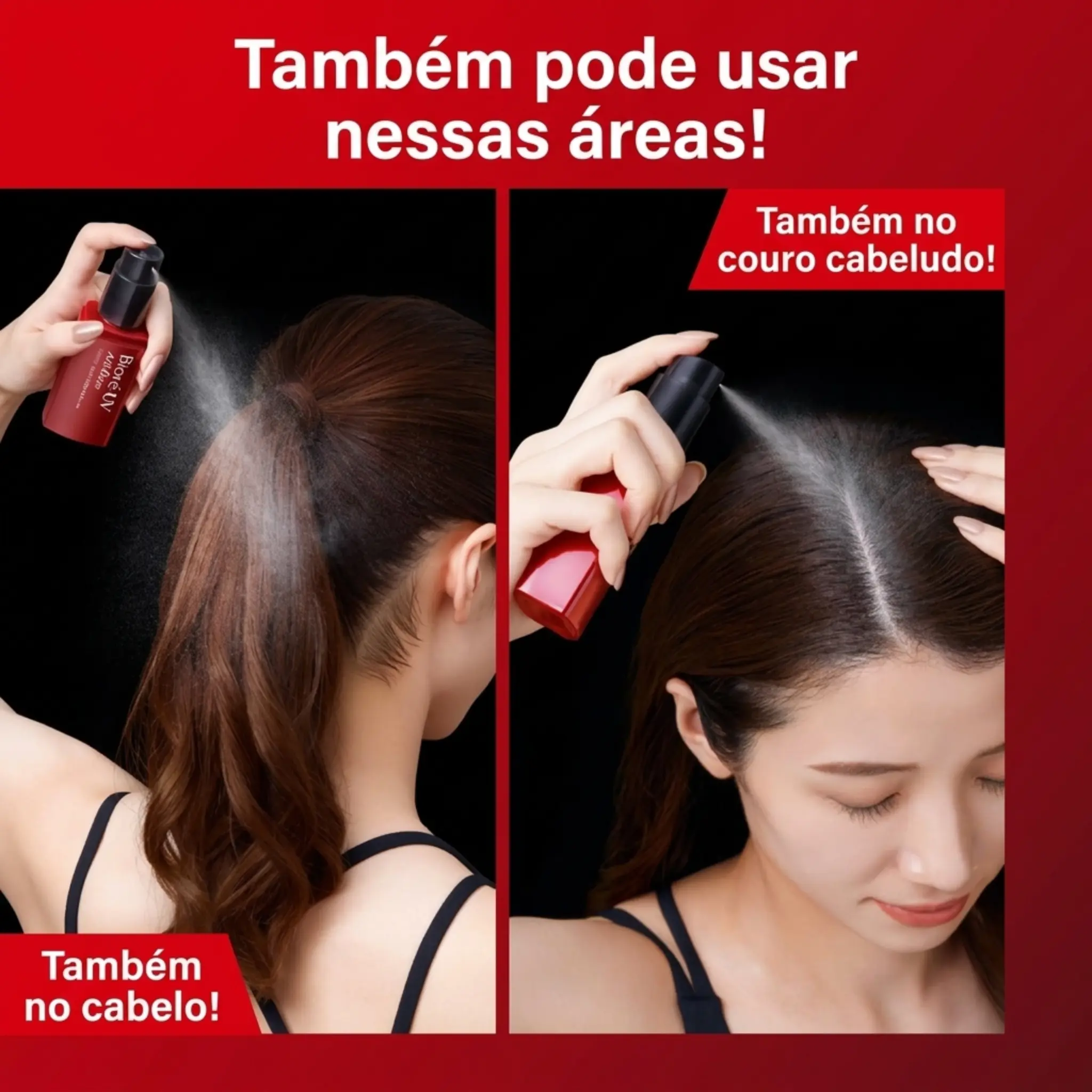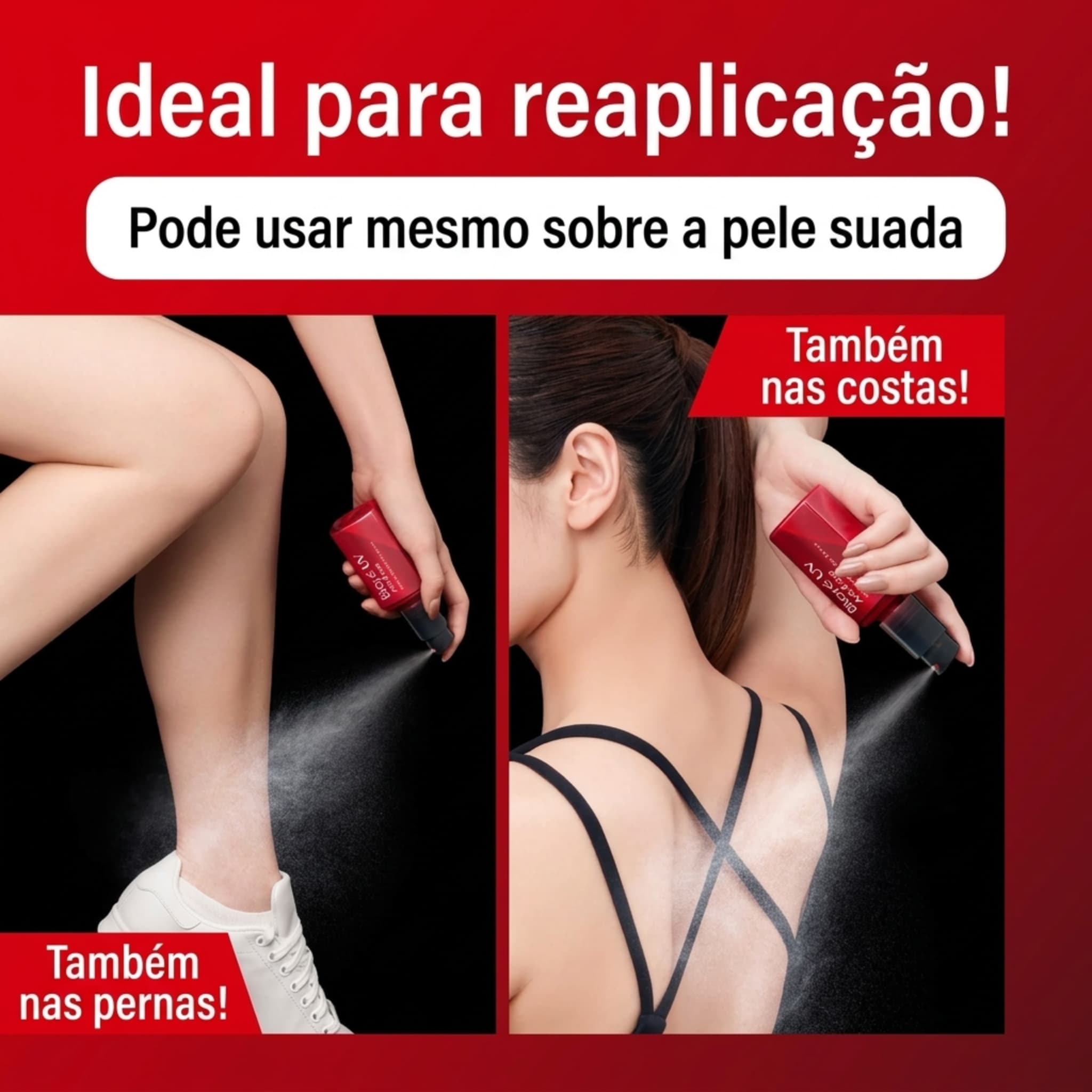 Sua aplicação em spray facilita o uso em áreas difíceis e sobre maquiagem, além de permitir proteção também nos cabelos, algo que a maioria dos protetores ignora.