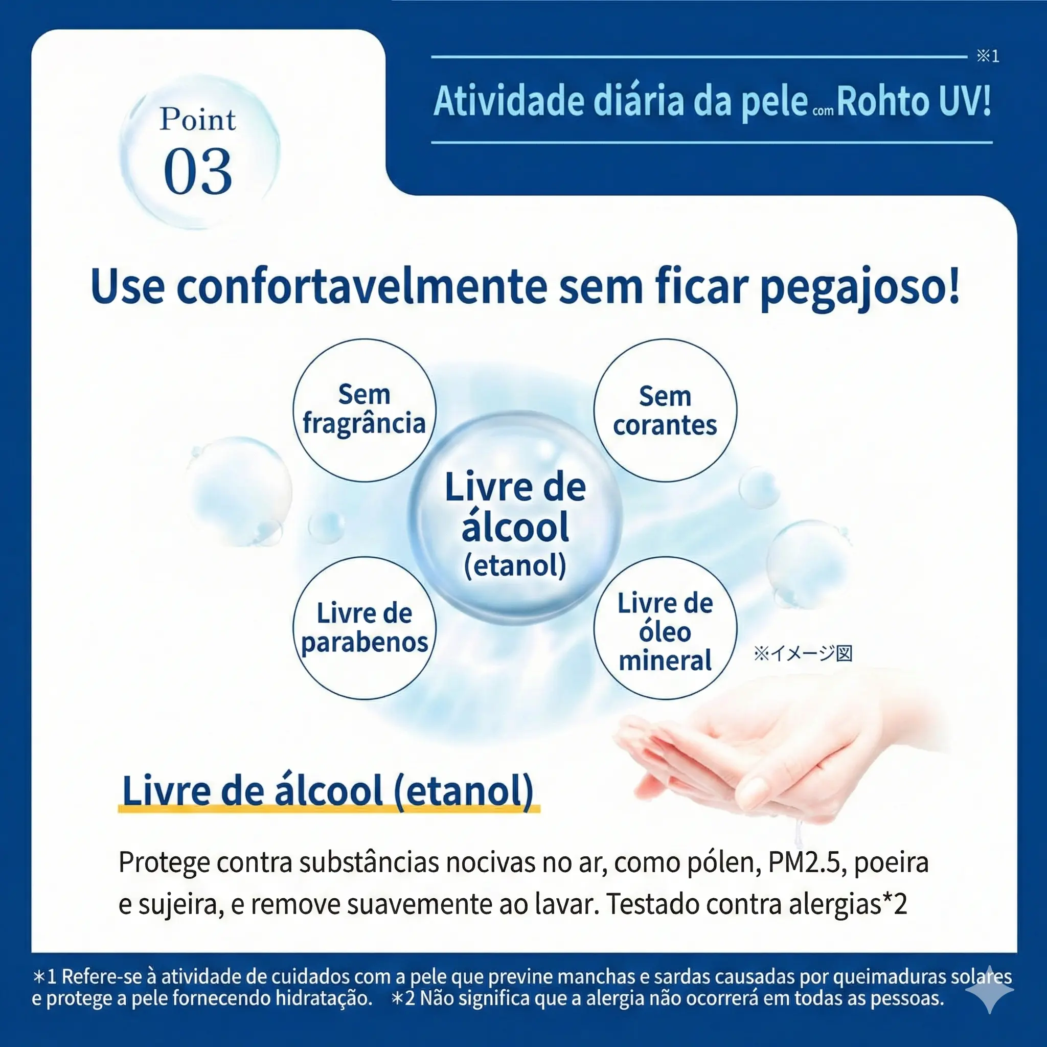 • Sem álcool (ethanol free): fórmula mais gentil, indicada para peles sensíveis.