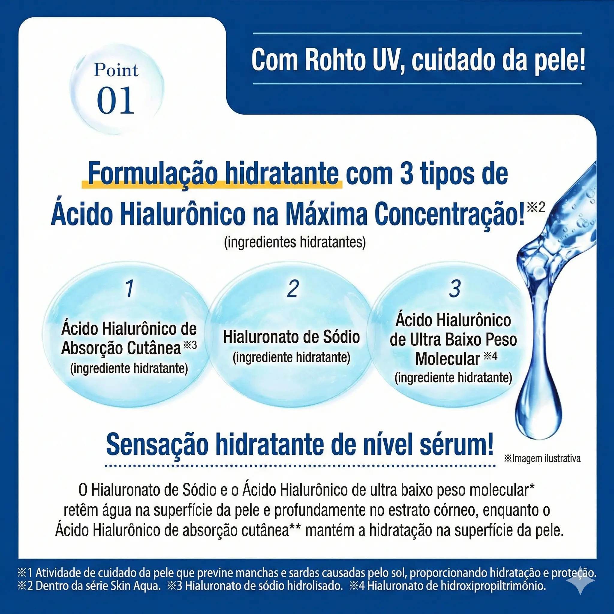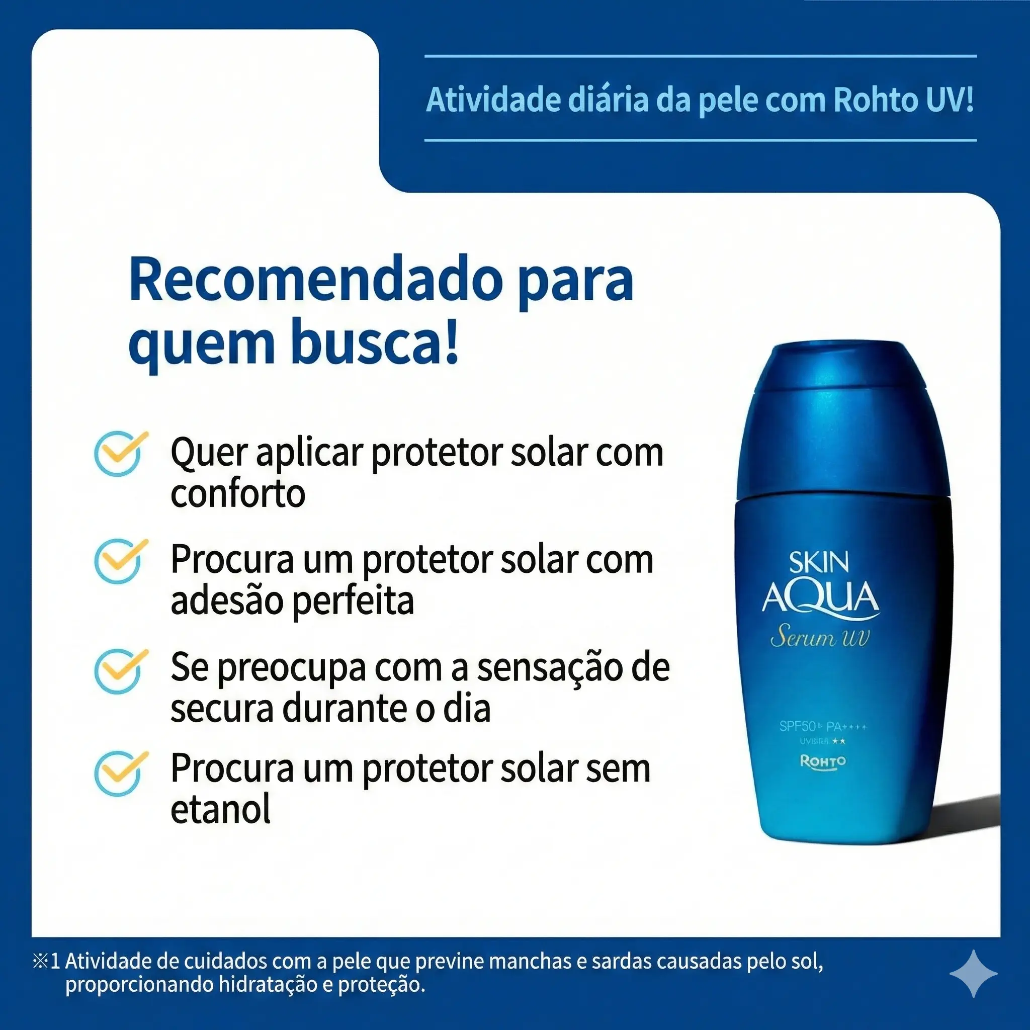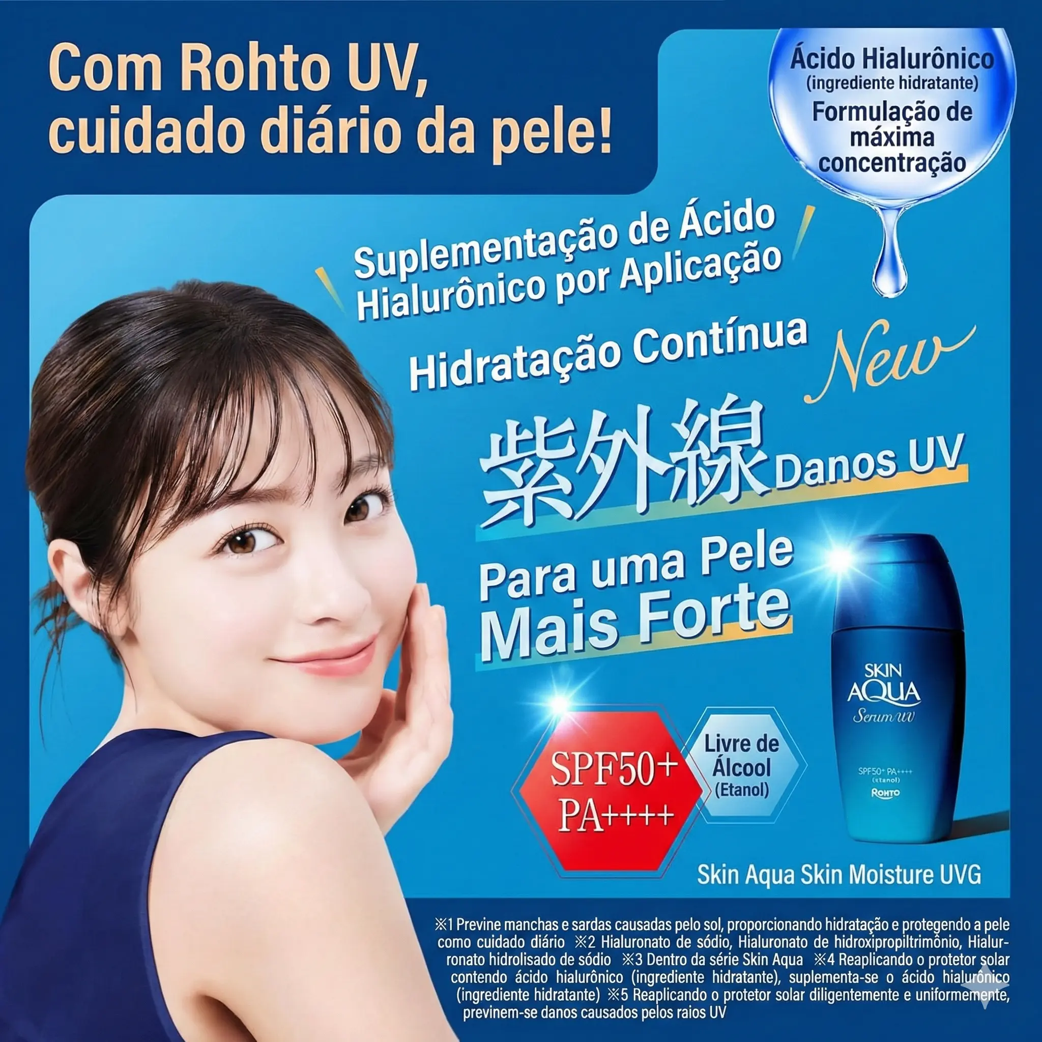 Protetor solar japonês de textura sérum desenvolvido para oferecer alta proteção UV combinada com hidratação intensa. A proposta da linha Skin Aqua é funcionar como um “skincare UV”, ou seja, proteger enquanto cuida da pele diariamente. A fórmula destaca alta concentração de ácido hialurônico, ajudando a manter a pele hidratada mesmo sob exposição solar. Possui acabamento leve, confortável e adequado para uso diário, inclusive como base antes da maquiagem.