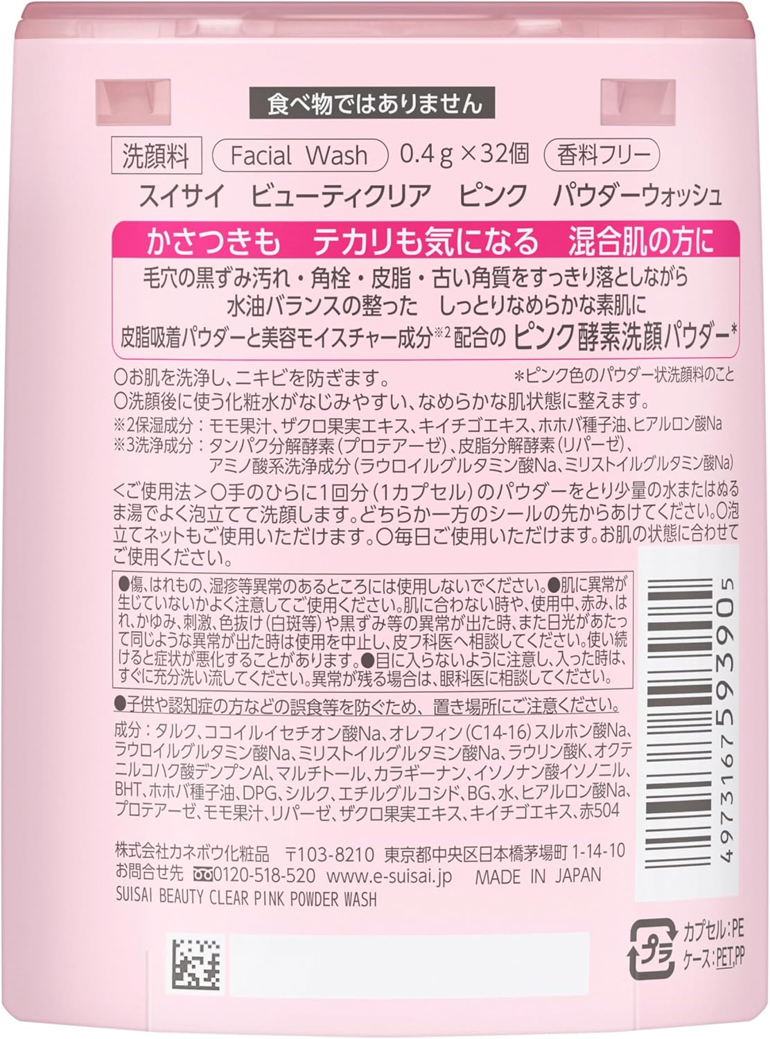 O Suisai Beauty Clear Pink Powder Wash é um limpador facial japonês em pó enzimático, formulado com duas enzimas poderosas e aminoácidos que se ativam com a água para limpar profundamente os poros, remover cravos, células mortas e excesso de oleosidade sem agredir a pele. Sua versão “Pink” é enriquecida com ingredientes hidratantes e seboabsorventes que mantêm a pele limpa, fresca e equilibrada, ideal para peles mistas e oleosas. Cada dose vem em cápsula individual, garantindo frescor e praticidade para uso diário ou em viagens.