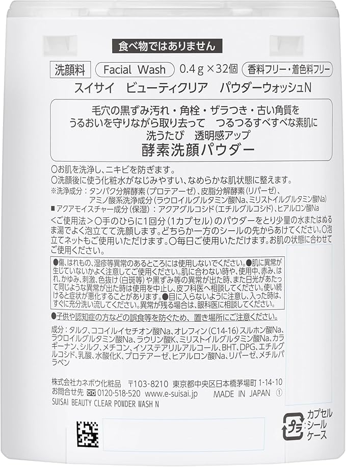 O Suisai Beauty Clear Powder Wash N é a versão aprimorada do famoso limpador facial em pó da marca japonesa Kanebo. Desenvolvido com enzimas ativas e aminoácidos suaves, esse pó transforma-se em uma espuma cremosa ao contato com a água, promovendo uma limpeza profunda que remove células mortas, cravos e oleosidade sem agredir a pele. Sua fórmula atualizada é ainda mais suave e eficaz, ideal para todos os tipos de pele, inclusive as sensíveis. O uso contínuo proporciona uma pele mais macia, luminosa e com poros visivelmente reduzidos.